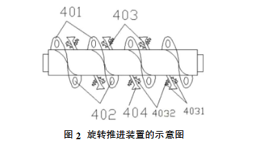 如圖1所示,本脈沖布袋除塵器用的二次除塵裝置,包括設置在脈沖布袋除塵器下箱體底部的導管2,還設有噴淋裝置3、旋轉(zhuǎn)推進裝置4和出漿管5,導管的出口端與旋轉(zhuǎn)推進裝置進料端連接,在導管與旋轉(zhuǎn)推進裝置的連接處還設置有噴淋裝置,噴淋裝置的噴水口穿過導管內(nèi)壁并朝向旋轉(zhuǎn)推進裝置的輸送料腔內(nèi),在旋轉(zhuǎn)推進裝置出料端連接出漿管;如圖2所示的旋轉(zhuǎn)推進裝置4包括輸送料筒、設置在輸送料筒內(nèi)的傳動軸以及帶動傳動軸旋轉(zhuǎn)的電機,在傳動軸上設有帶漏料孔402的螺旋葉片401,螺旋葉片之間還設置有攪拌棒403,攪拌棒403一端與傳動軸固定連接,另一端設置清除輸送料筒內(nèi)壁灰塵的刮刀404;所述的噴淋裝置上還設有進水開關(guān);所述的旋轉(zhuǎn)推進裝置出料端設置有噴淋裝置;所述的傳動軸兩側(cè)均設置攪拌棒403,且刮刀404與攪拌棒403之間的角度為75-135°。